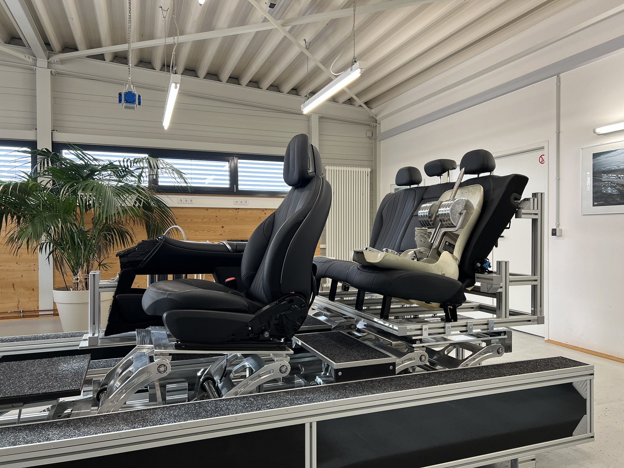 This CNC seating buck also introduces a new, refined design concept. All lifting and adjustment mechanisms are discreetly integrated beneath the floor-level platform. As a result, test subjects experience only the interior components and design elements of the latest vehicle generation—without distraction from visible seating buck mechanisms extending above the floor.